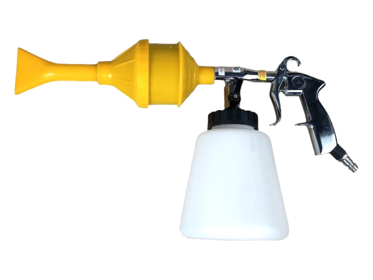 Многофункциональный чистящий пистолет оснащен гибкой трубкой малого диаметра, вращающейся посредством сжатого воздуха, через которую распыляется моющая жидкость, что позволяет быстро удалять загрязнения различного происхождения с ткани, велюра, винила, пластика и других материалов. Под давлением компрессора жидкость смешивается с воздухом, образуя вихрь с быстрыми оборотами, выдавая что-то вроде небольшого торнадо.